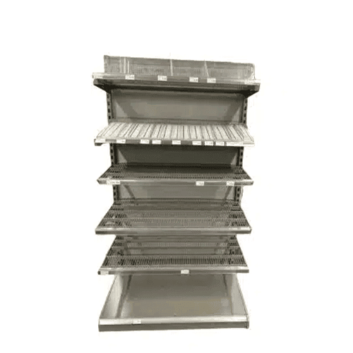 Gondoles doubles faces d’occasion en finition gris, conçues pour optimiser l’espace de vente en magasin. Elles offrent une présentation visible et accessible des produits sur les deux côtés, idéales pour linéaires centraux. Équipées de tablars robustes disponibles en plusieurs dimensions, elles s’adaptent à une grande variété d’articles.