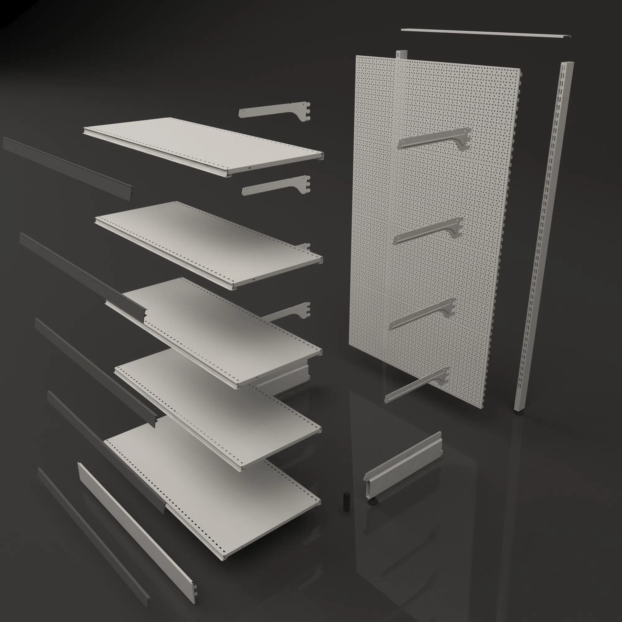 Inclus dans le tarif de base (2 montants, 2 pieds, 2 vis, 2 disques, 4 plaques de fond perforé 42 cm, 2 caches montants, 2 caches pieds)